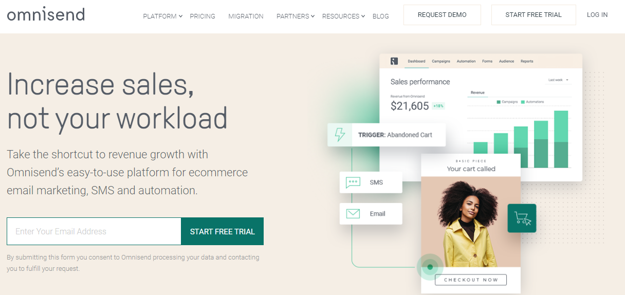 Omnisend is another email marketing platform that integrates all your communication platforms in one place. Its free plan includes only email, but it’s more than enough to support the email marketing efforts of small and medium businesses. It allows you to automate your email delivery using behavioral triggers and easily time your communications based on your customers’ convenience.