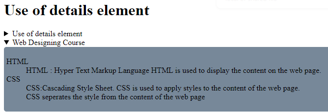 <details> element can be used to display the headings and to hide the details of the headings.We can use this as menus also.