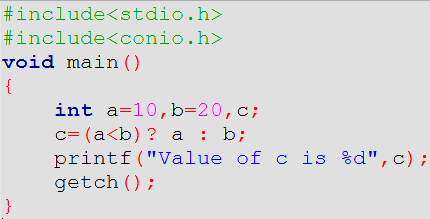 In the above code value of a is 10 and value of b is 20.Here,compiler first check the condition,and condition is ( a<b )which is true so control go to first expression that is a and then return the value of a and assign to c.So, the value of c will be 10.