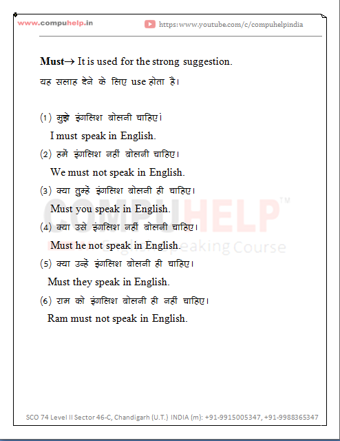 Must is used for necessity(आवश्यकता),compulsion(अनिवार्य),prohibition(निषेध)etc.We can say that it is used for strong suggession.